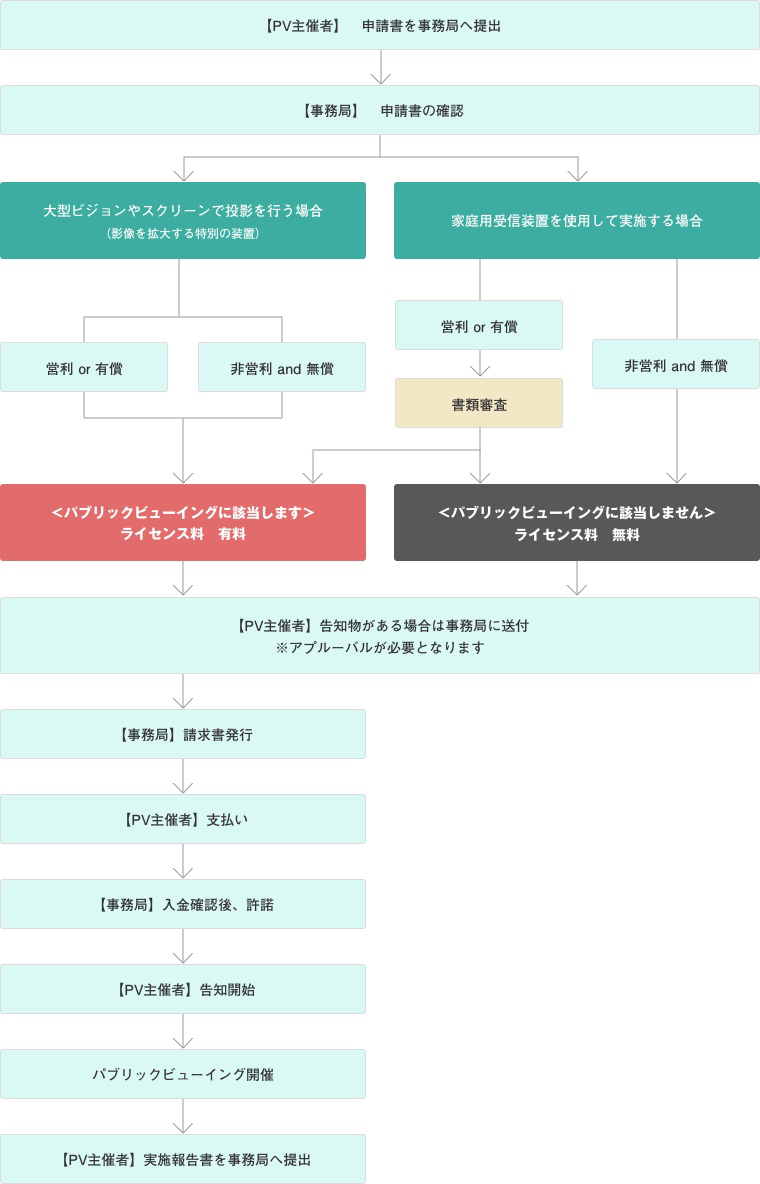 5. 申請を受理した後、内容に問題がなければ、パブリックビューイング事務局から請求書を発行します。入金確認後、別途パブリックビューイング事務局が定める書式により許諾します。